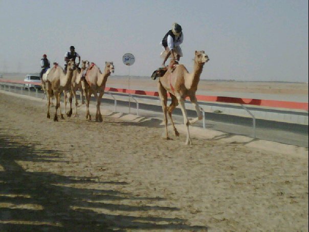 The camel race is not like a horse race in that not all of the camels are all that interested in running. There are hundreds of camels in the race, and with some of them running at top speed, and some of them loping along not giving a damn about the race, it’s not a fast process, and there’s no grouping. We saw a number of camels that had thrown their riders; eventually, you see the riders walking along the track as well. I don’t think the camel race is something that most foreigners get to see, and it’s definitely not something that women attend. The reason I know this is that the clubhouse only had men’s bathrooms, not women’s. The Emirati guys that came with us from Dad’s firm had to clear out the bathrooms, then stand guard so the ladies could relieve themselves.