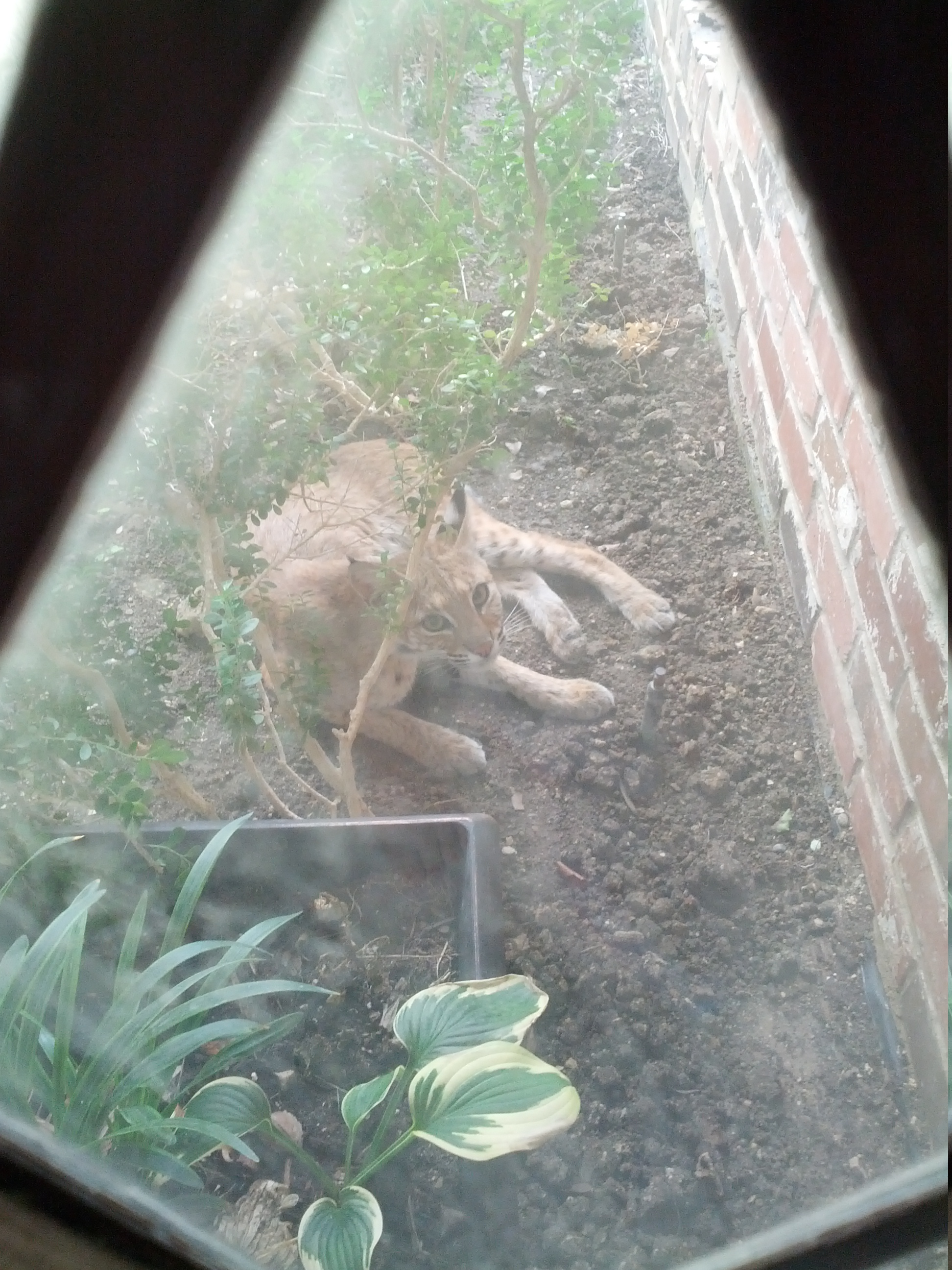 While I was taking photos, the bobcat, which my friends Christian and Dave named “Lola” and “Bobbie,” respectively, woke up. LolaBobbie did not seem at all concerned to see a large human. Maybe it understood that the window offered both of us protection. Or maybe all the literature is wrong. In any event, LolaBobbie stood up, stretched, and ambled to the ledge of the flower bed outside my bedroom.