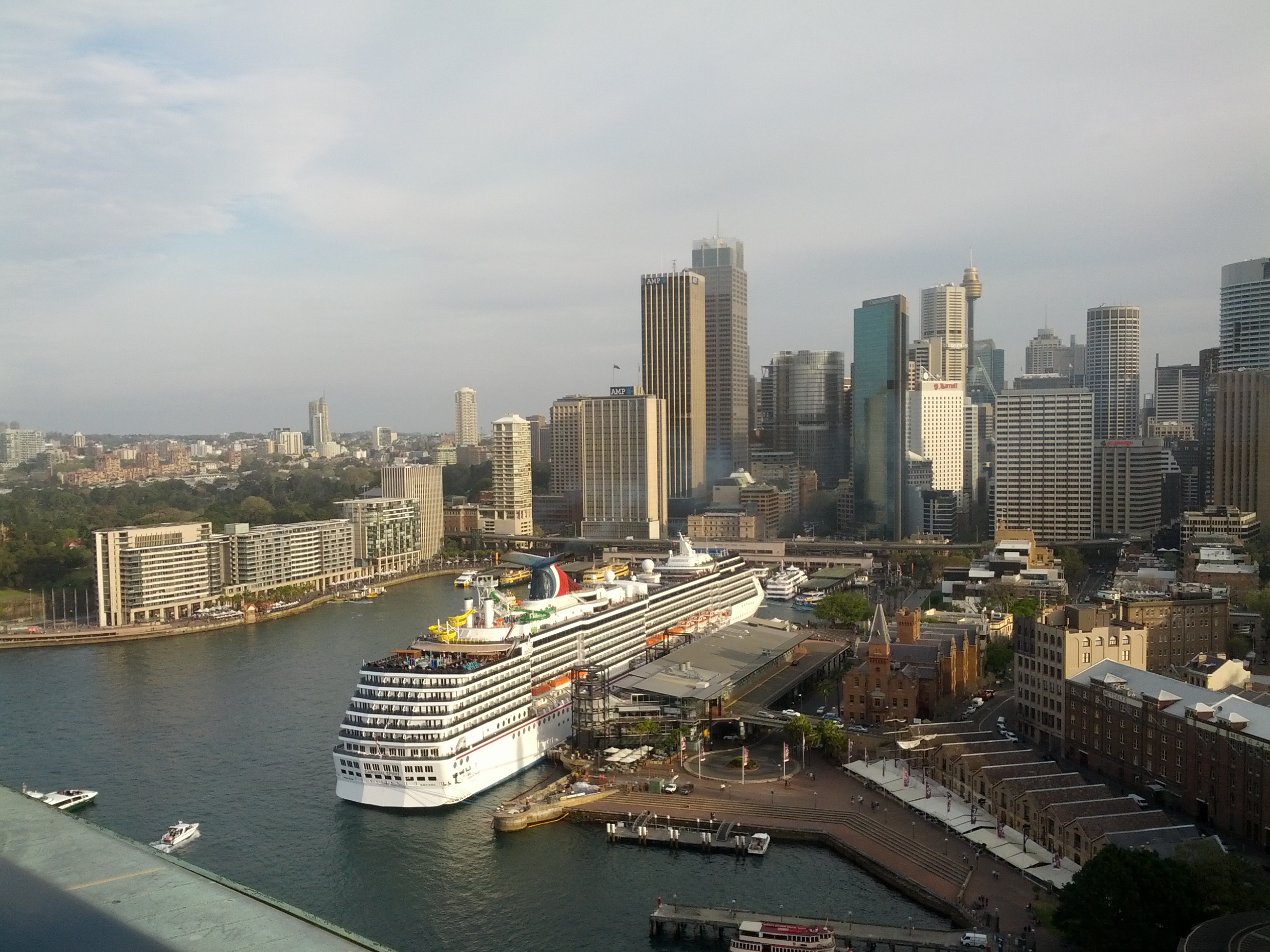 Friday morning, we reported to the reception desk of Bridgeclimb (several minutes west of the Rocks on the southwest side of Circular Quay) at 9:25am for our 9:35am reservation. We left Bridgeclimb around 12:35pm after purchasing mementos, and we found a place to eat on the southeast side of Circular Quay. We finally got to sit at 1pm for the first time since arriving at the harbor. After we ordered, Loraine remembered that our tickets for Bridgeclimb included admission to the museum housed in the southeast pylon of the Sydney Harbor Bridge. She said, “I think we have to go see it.” I contemplated the walk all the way back to the other side of the quay and beyond, the fact that we’d been two desk jockeys on our feet standing or walking for almost four hours, and the slight reluctance I heard in her voice, and said, “Do we?” I thought I was giving us an out to miss the museum. She shocked me when she said, “Yeah, I think we do.” I tried to talk and whine my way out of it, and I hoped that lunch would take so long that we wouldn’t have time to walk back over. All to no avail – the Viking, who berated me only two days before about NOT walking was steadfast.